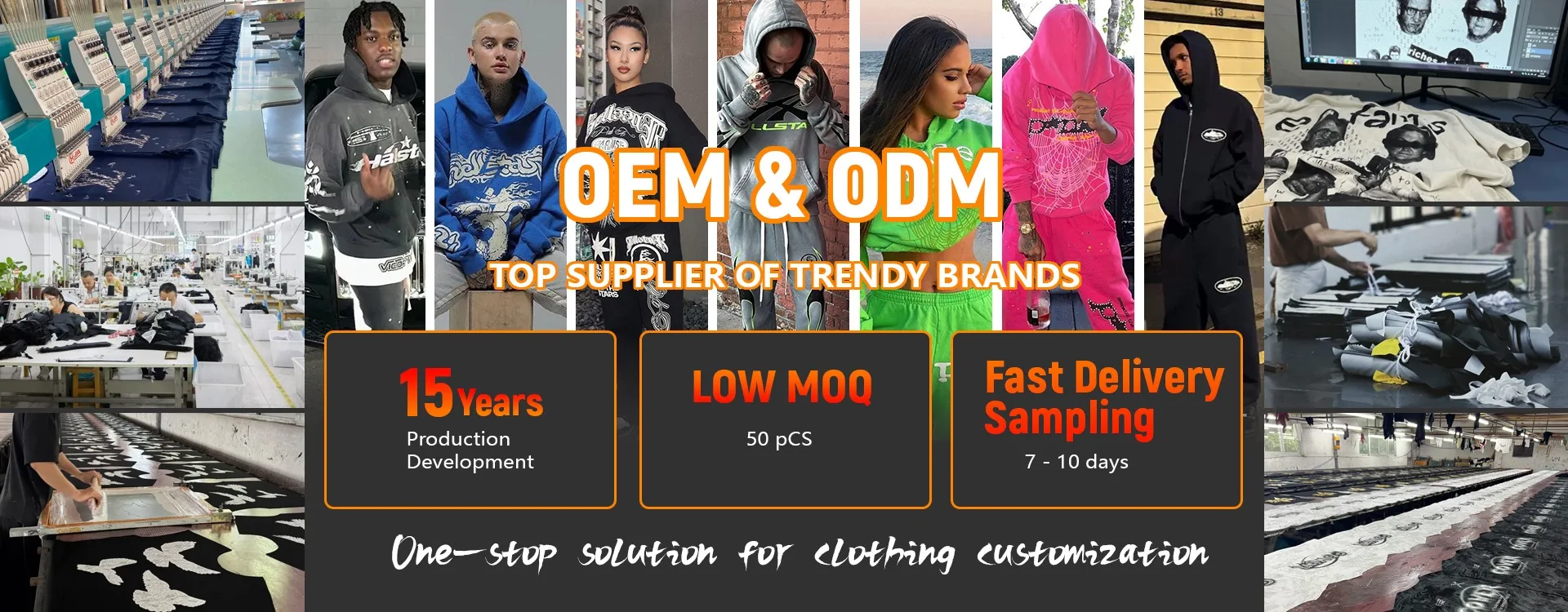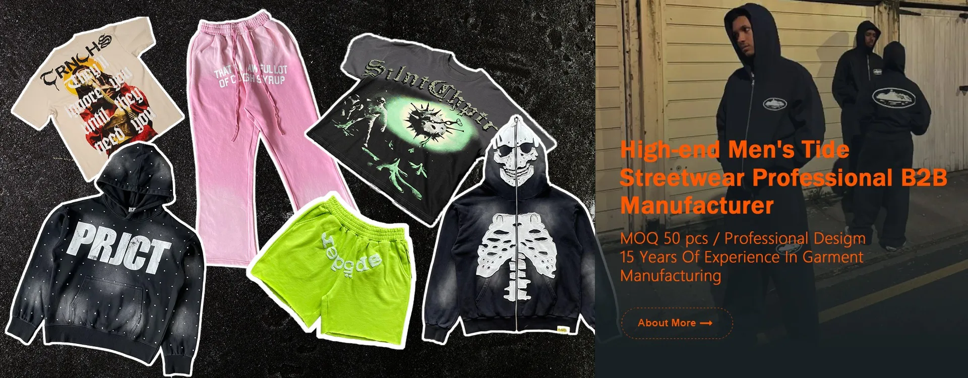 Main Products: T-shirts, hoodies, dresses, shorts, joggers, jeans, outerwear, and more. Key Techniques: DTF/DTG printing, silk screening, puff printing, embroidery, embossing, heat transfer rhinestones, acid washing, and other advanced treatments.